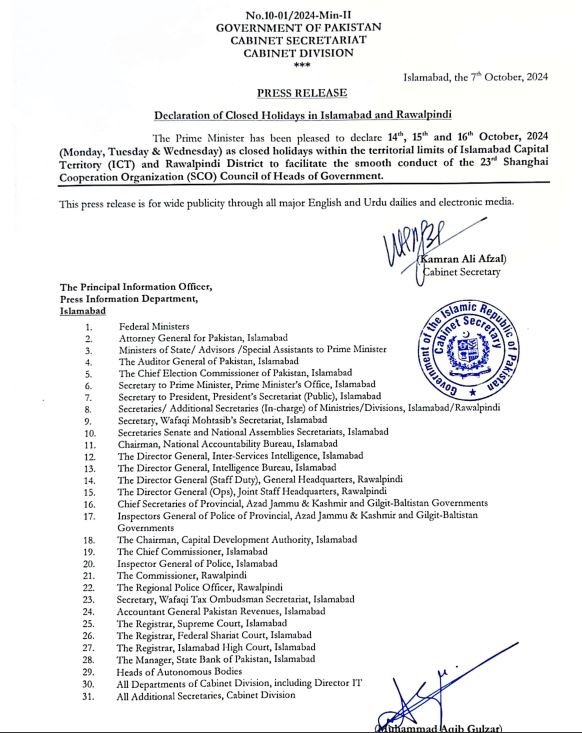 اس ضمن میں جاری نوٹی فکیشن کے مطابق شنگھائی تعاون تنظیم کانفرنس کے پیش نظر اسلام آباد اور راولپنڈی میں تین دن کی عام تعطیل کی منظوری دی گئی ہے۔