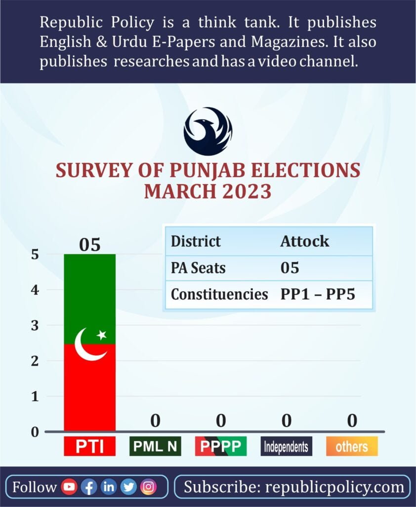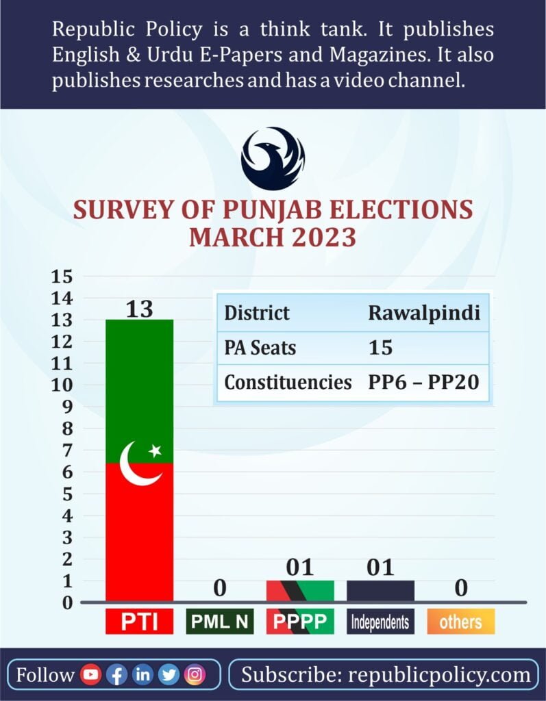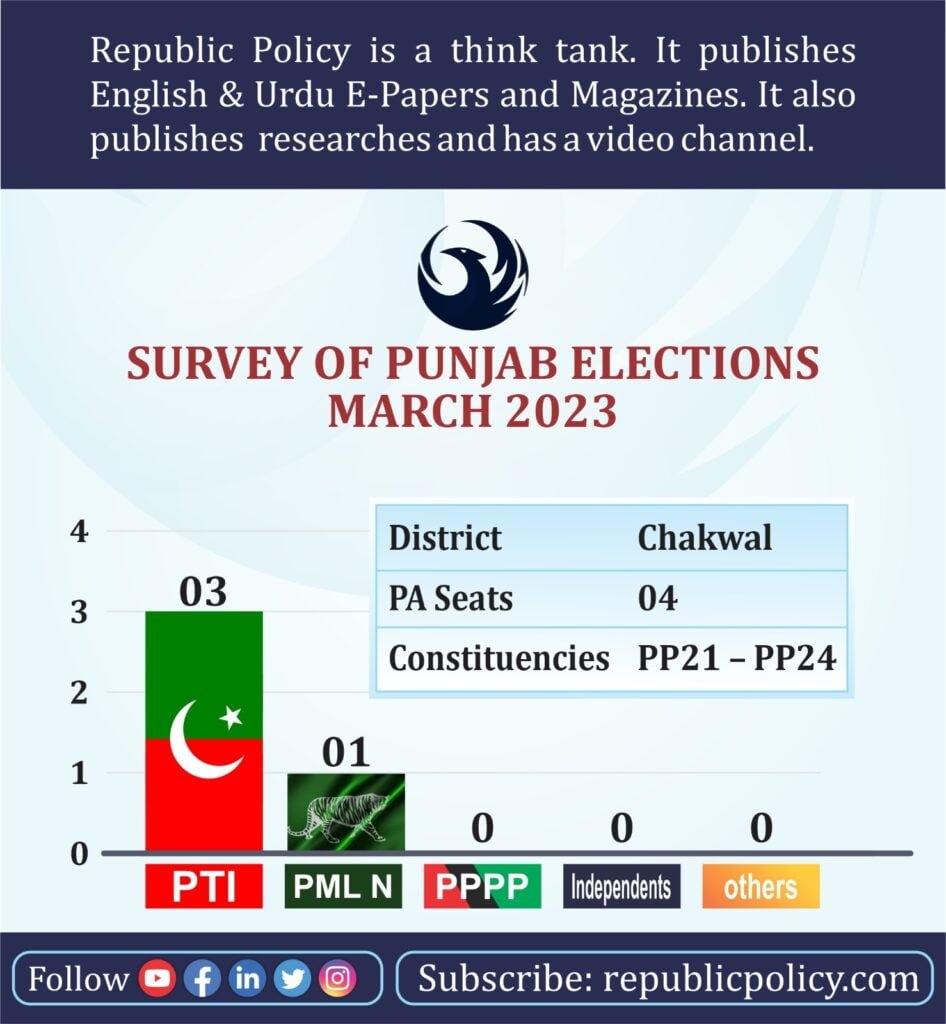 According to the survey conducted by the republicpolicy.com, PTI is leading the district by a long distance followed by PMLN.